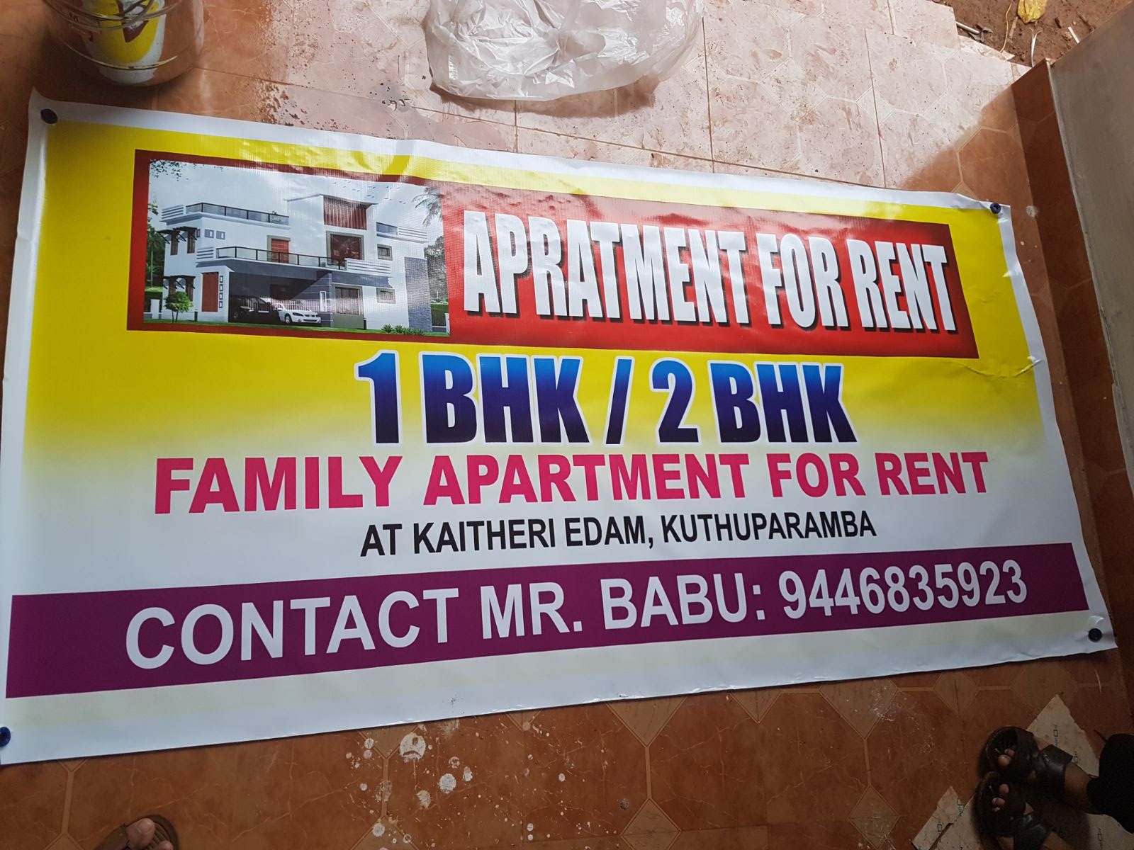 Newly constructed 2 Bedroom Hall Kitchen apartment within few meters from the main road, in Kaitheri Edam, Koothuparamba, Kannur. Hospital, school, college, supermarkets, temple, masjid etc are within 2-3 kilometres and Mattannur airport is 10 kilometres away from here, 7 units already sold and 3 units balance with affordable monthly rent 8000 – 9000 only. Contact Mr. Babu 9446835923
